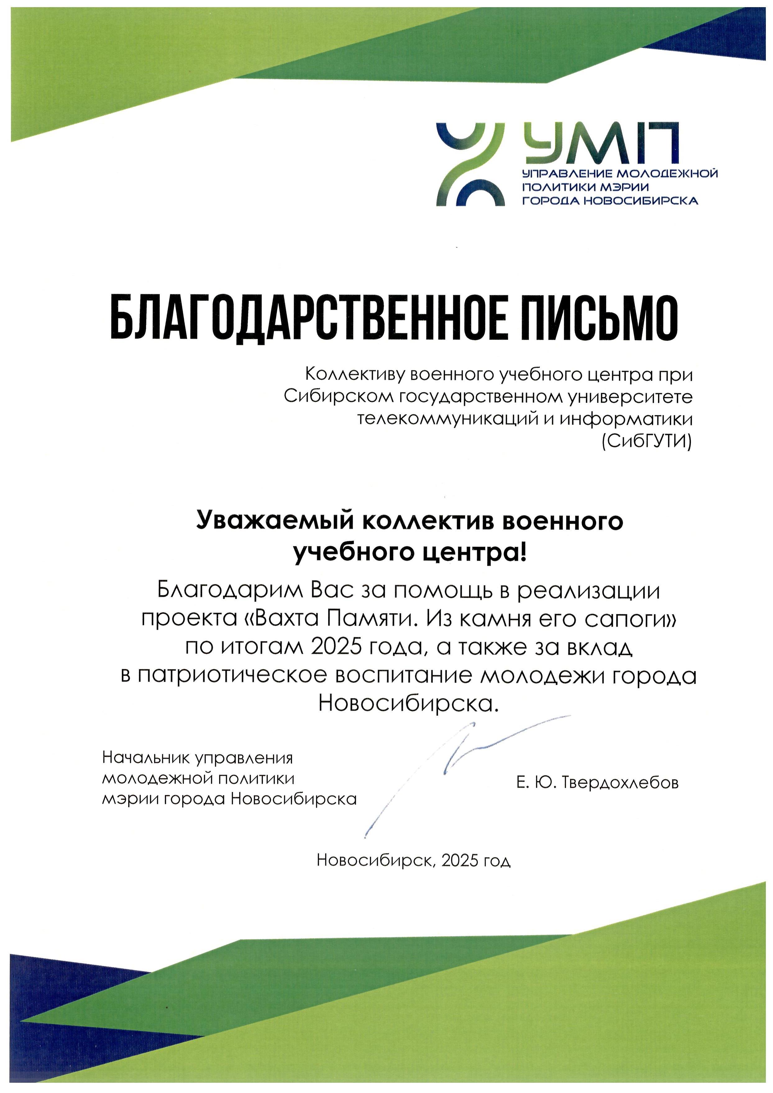 За помощь в реализации проекта "Вахта памяти. Из камня его сапоги" по итогам 2025 года, а также за вклад в патриотическое воспитание молодежи города Новосибирска коллектив военного учебного центра при СибГУТИ награжден Благодарственным письмом начальника управления молодежной политики мэрии города Новосибирска.